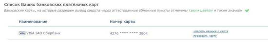 Посетив в раздел «Ваши банковские карты и счета», Вы увидите, что проверенная карта помечена зеленой галочкой.